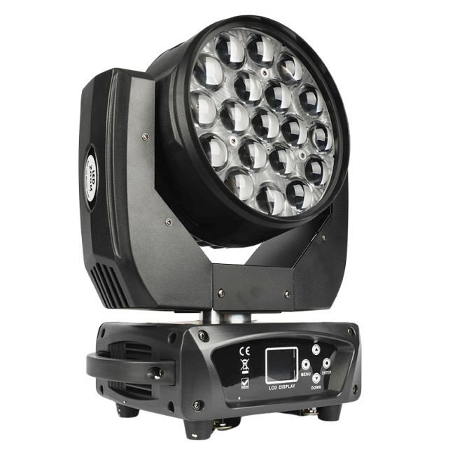 The 19x15W moving head wash with zoom is equipped with 19 RGBW LEDs (4in1) of 15W each, super bright, in a classic plastic casing.
